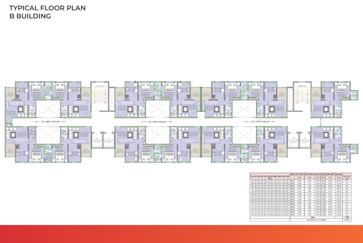 - B Building: 14 per floor