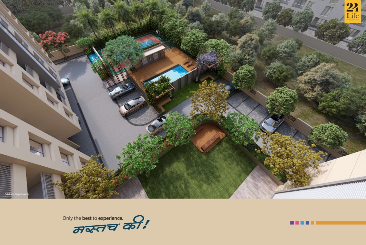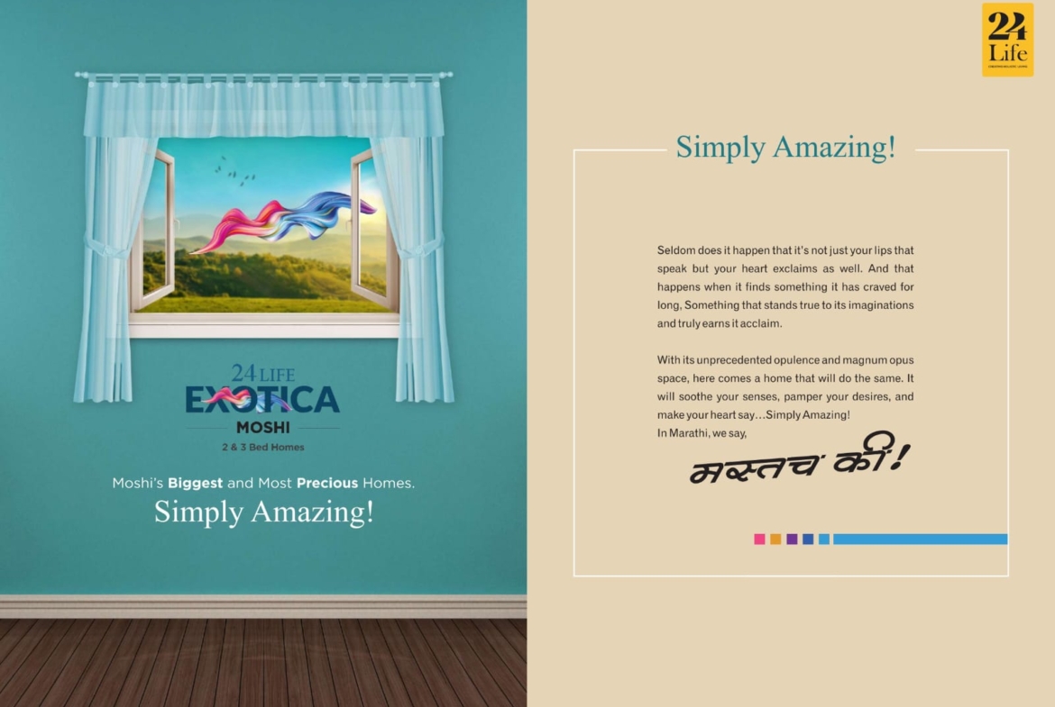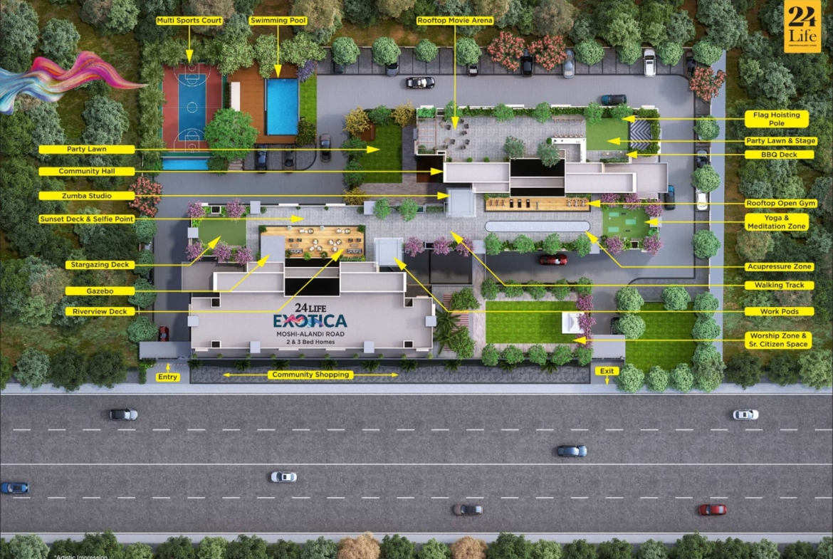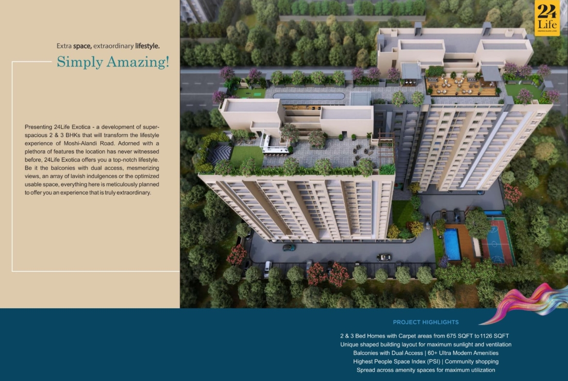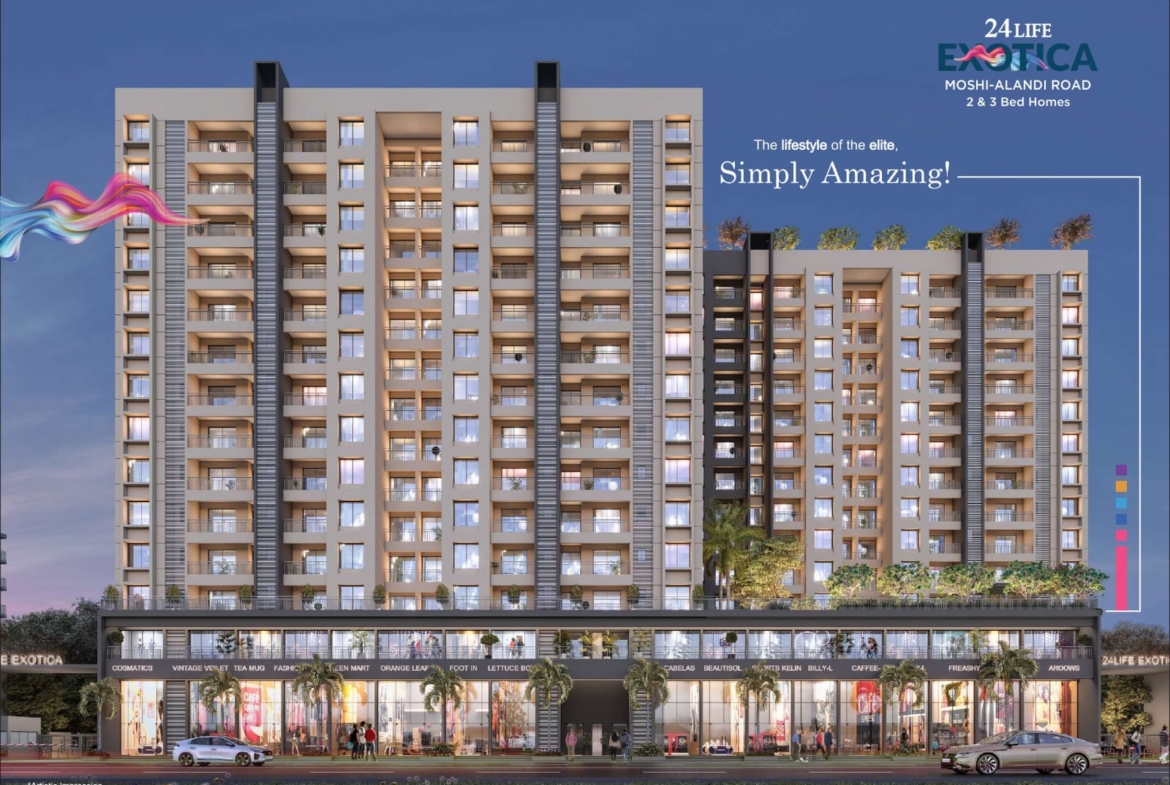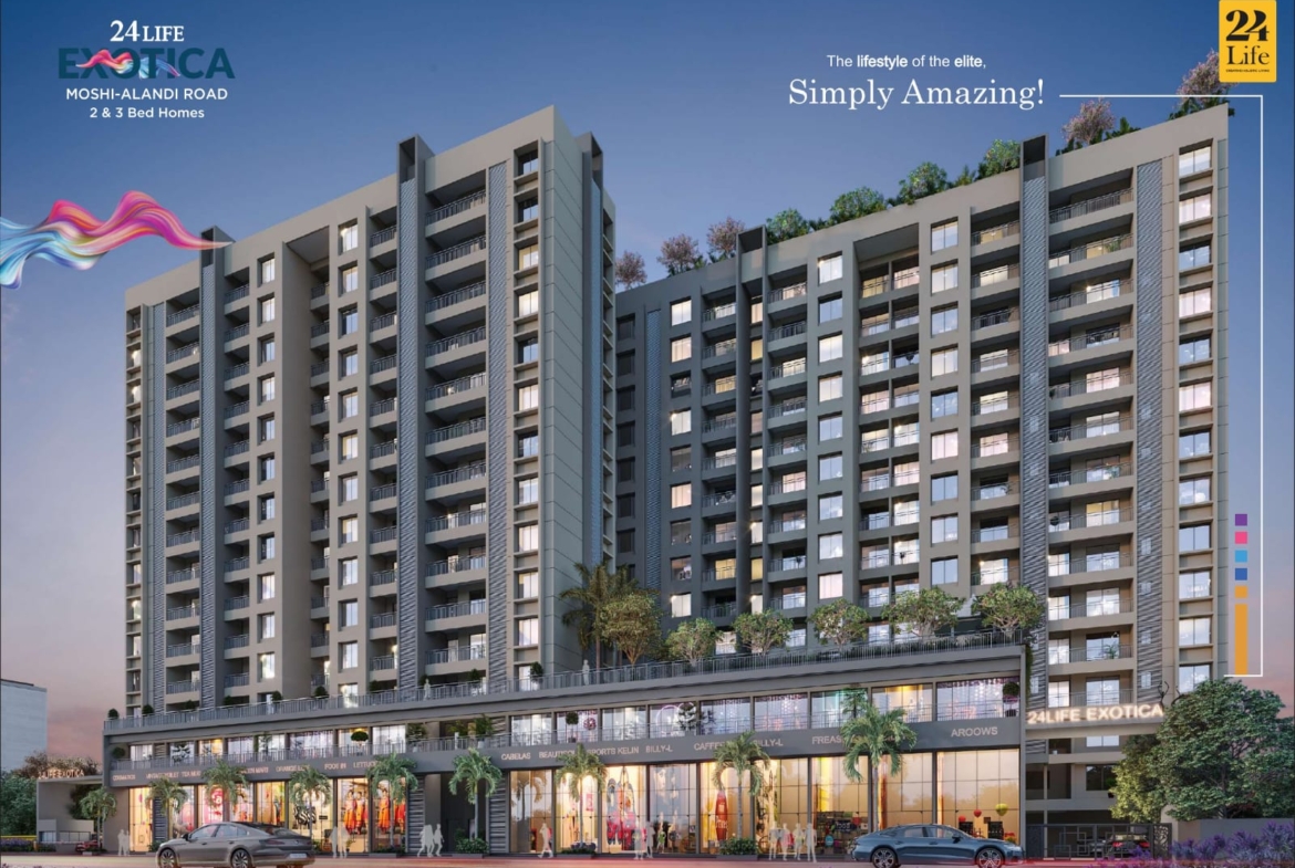 Check out this residential project for sale by 24LIFE in Moshi, Pune. 24Life Exotica offers Apartment as property type. The project has been developed in an area of 1.31 Acres . It is currently Under Construction. Available configurations include 2 BHK, 2.5 BHK, 3 BHK. As per the area plan, units are in the size range of 675.0 – 945.0 sq.ft.. 24Life Exotica was launched in February 2023. 24Life Exotica possession is Dec, 2026. Altogether, there are 208 units available. There are 2 buildings in this property. The address of 24Life Exotica is Gat No.199(P), Dudulgaon, Moshi-Alandi Road.